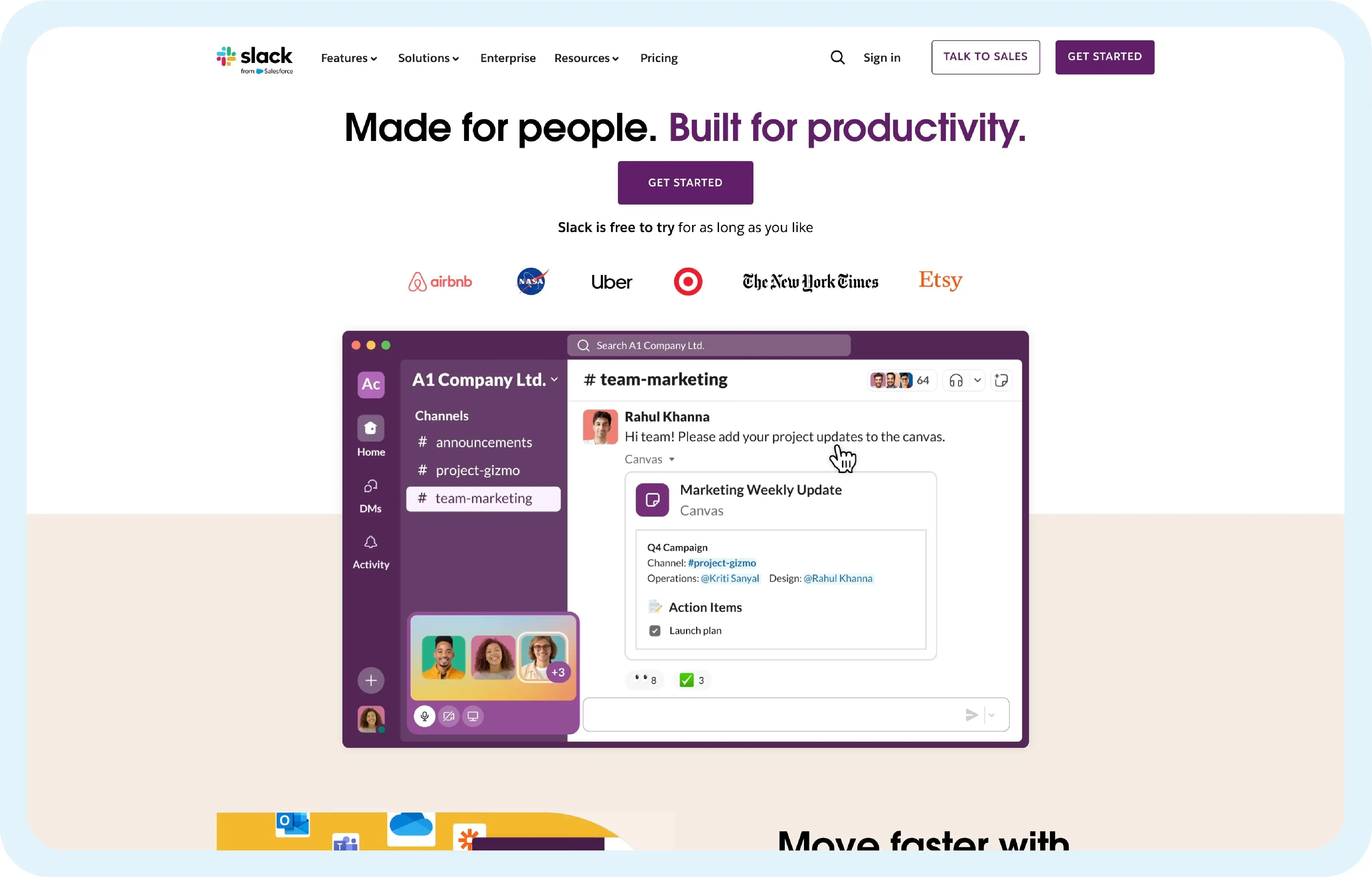 Slack is widely used for team communication and collaboration. While it’s often associated with real-time chat, Slack also supports asynchronous workflows through channels where team members can post updates, share files, and leave messages that others can respond to later. It’s particularly useful for organizing communication by project or topic, making it easy to track conversations over time.