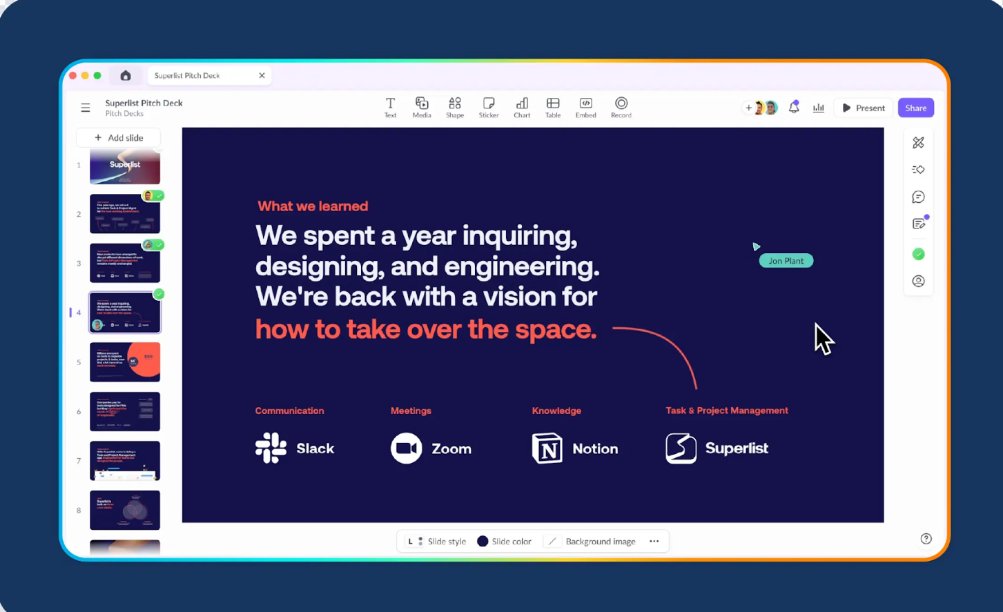 If your team lives in tools like Slack, Notion, and Zoom, Pitch will feel natural.