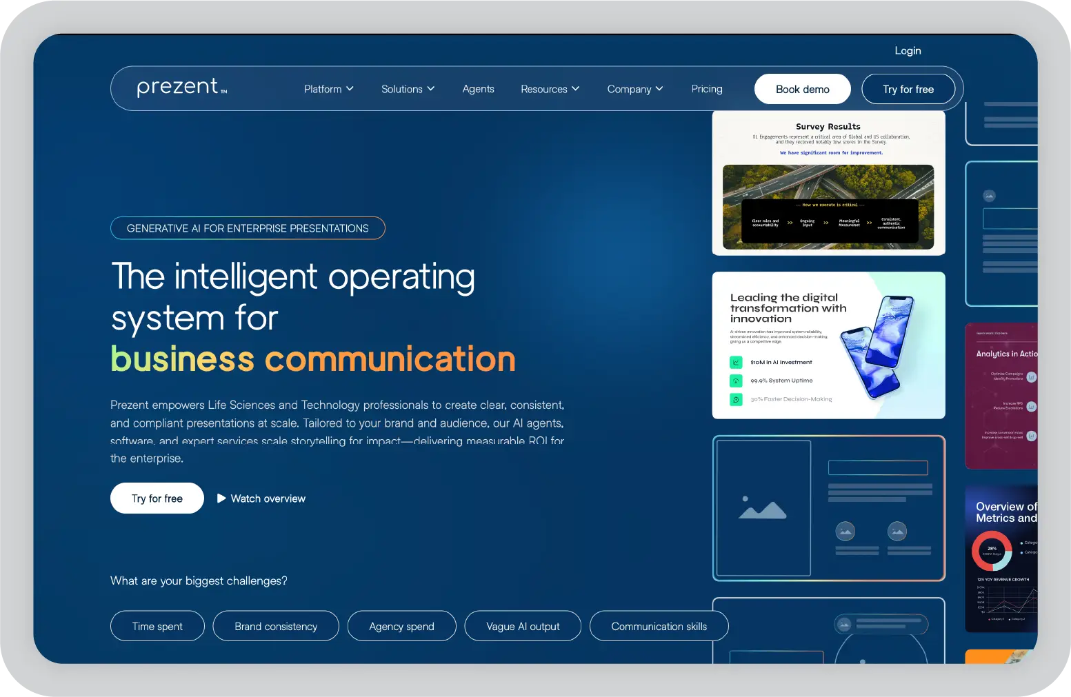 Prezent AI is an AI-powered business communication platform built for enterprises where presentations play a key role in decision-making. This includes leadership reviews, board updates, customer proposals, and QBRs.