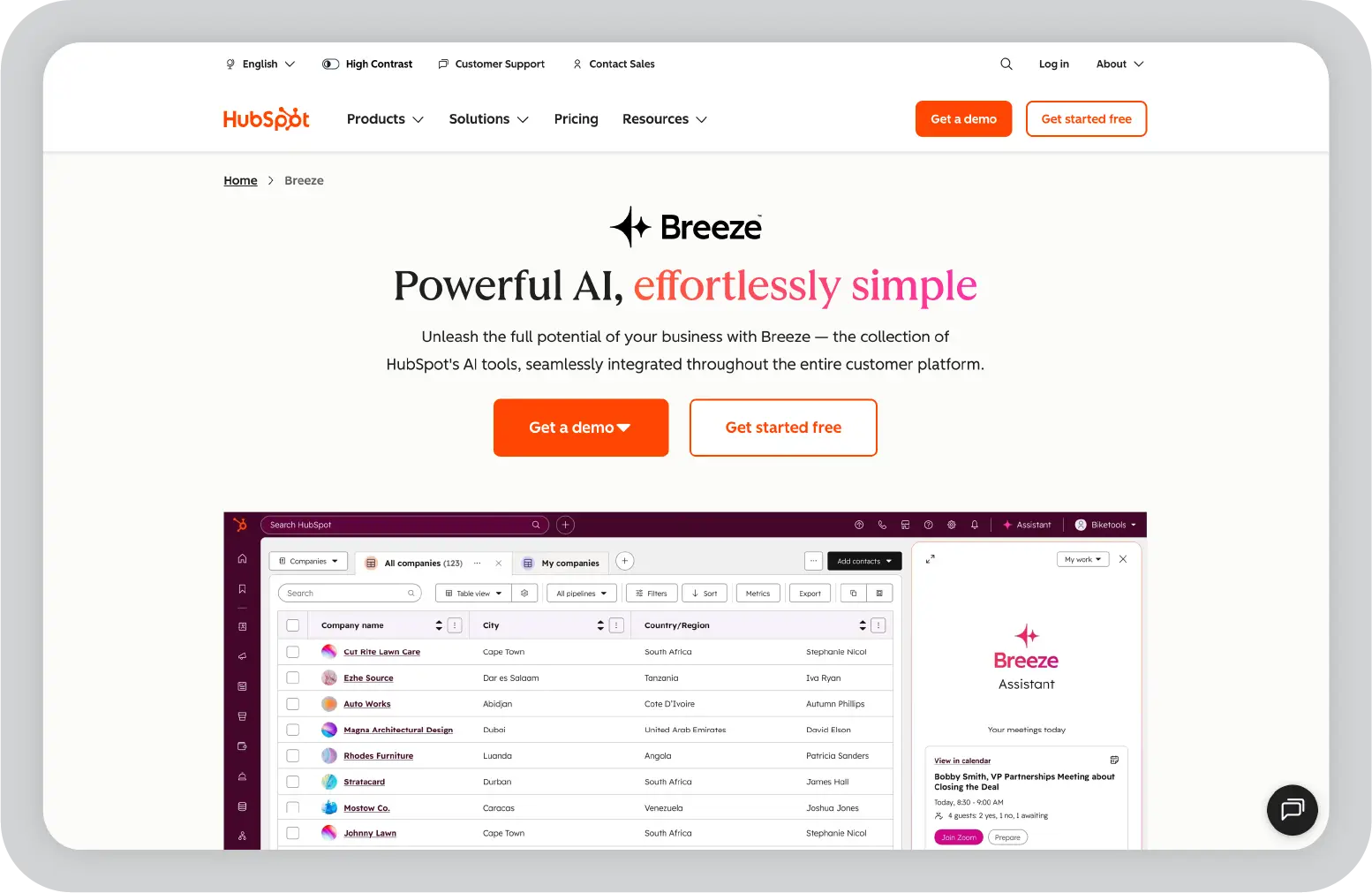 HubSpot’s AI suite, called Breeze, is built directly into the HubSpot platform. It supports lead scoring, email personalization, content creation, prospecting, and customer support. Because everything runs on the same CRM data, marketing, sales, and service teams work from a single view of each contact and account.