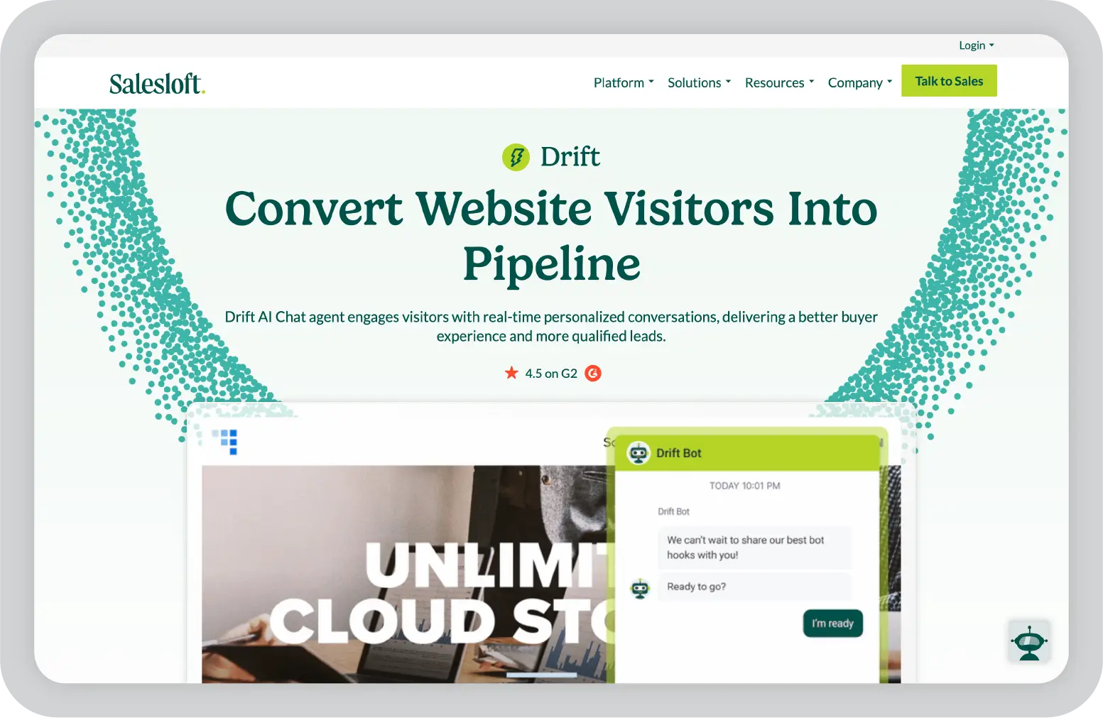 Drift places AI chatbots on your website to engage visitors, answer common questions, and qualify leads in real time. It also allows qualified prospects to book meetings directly into a rep’s calendar, which reduces friction and speeds up the path to conversation.
