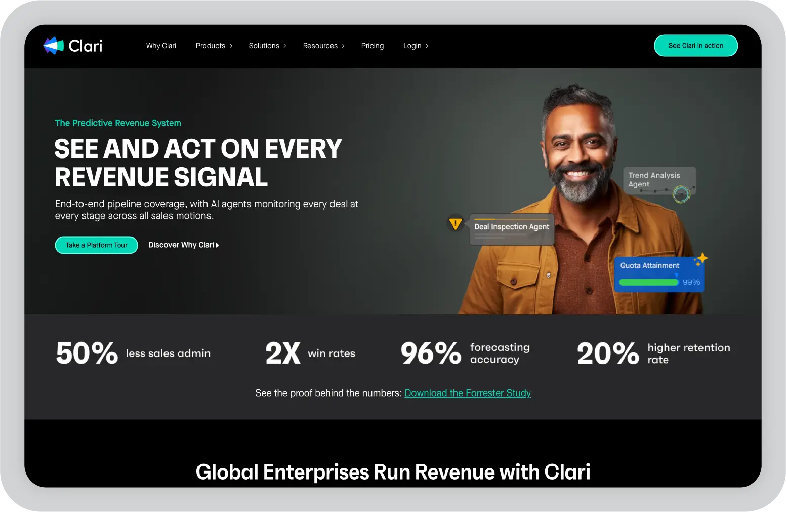 - Clari pulls everything together into a clear view of the pipeline and forecast