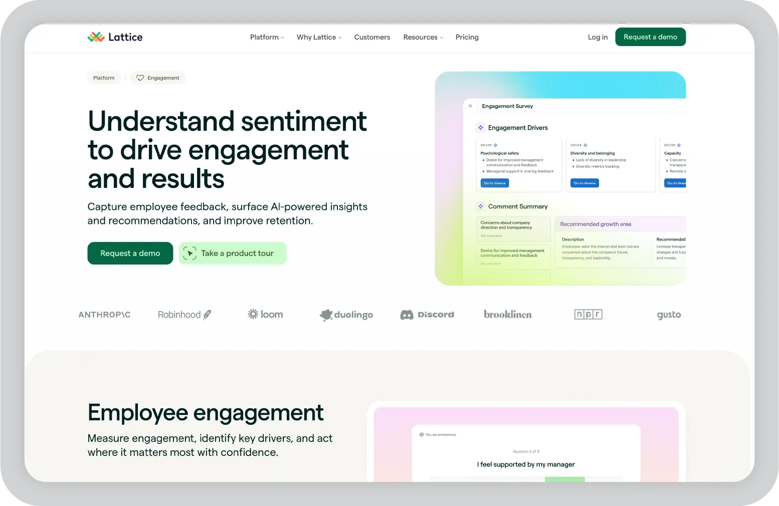 Lattice also uses AI to help managers identify engagement risks early, run structured review cycles, and connect individual goals to broader company objectives.