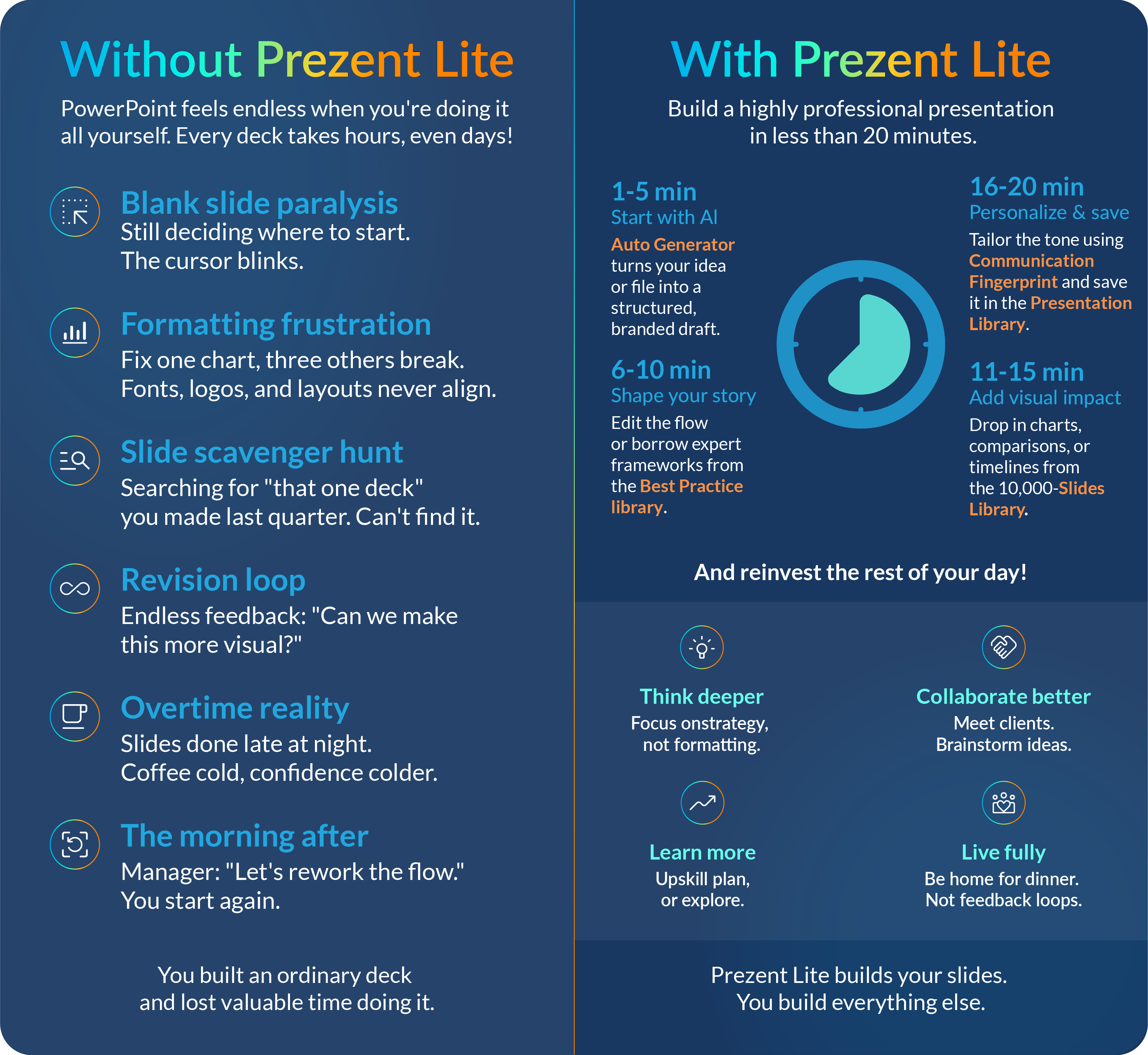 Here’s what really slows you down—and how Prezent Lite helps you move faster, without compromising on quality.