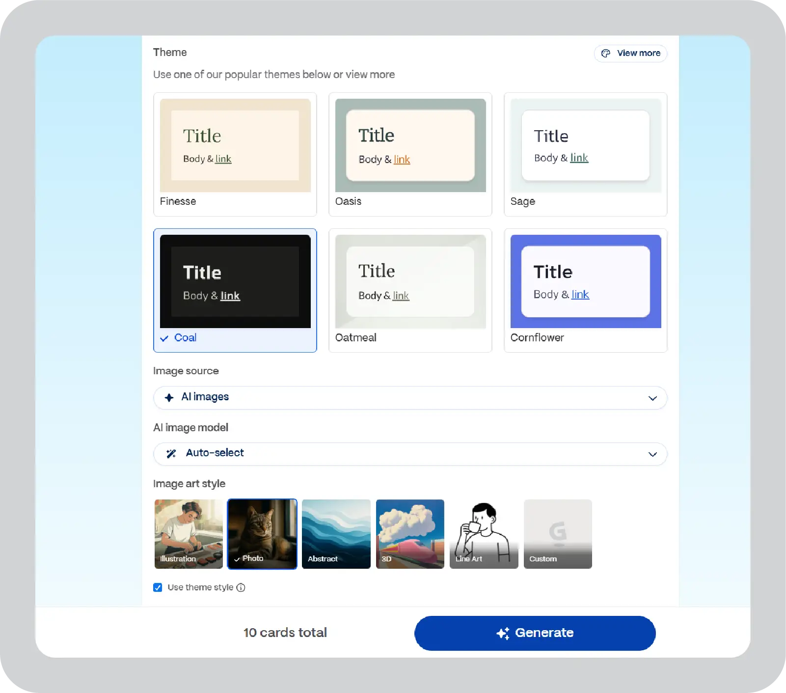 Gamma uses a vertical, card-style format instead of traditional slides. This approach supports embedded media such as videos, charts, calendars, and interactive elements. While this format works well for link-based sharing, it may not align with enterprise presentation standards that require slide-level control and PowerPoint compatibility. - Themes and branding