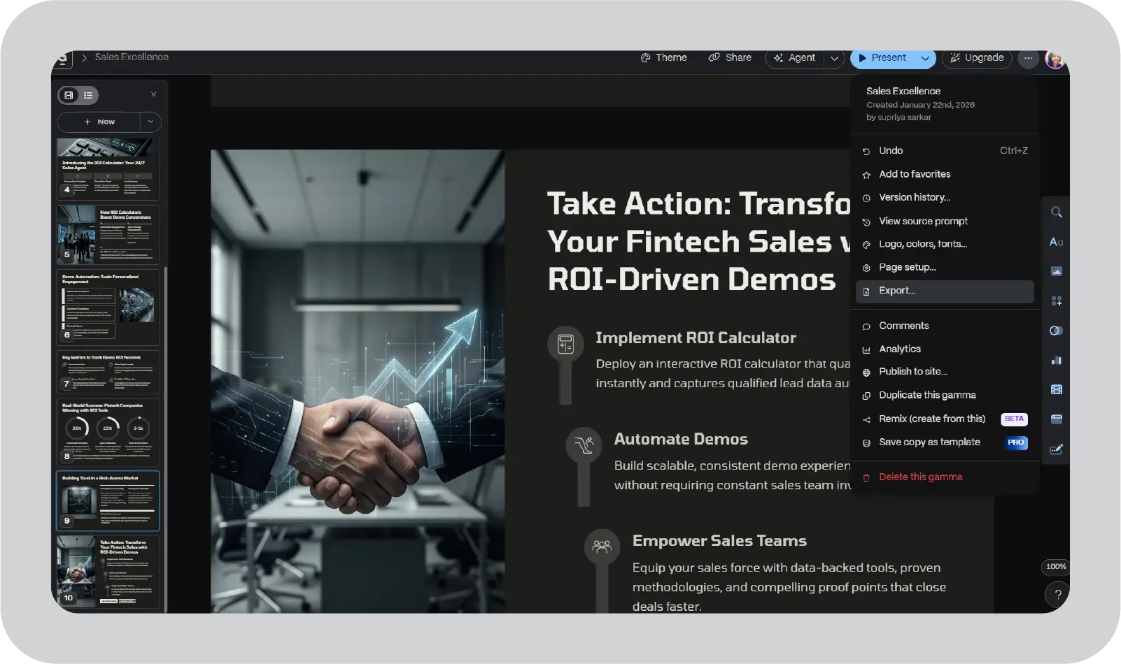 Use Gamma links to collaborate on internal drafts, async reviews, and quick feedback. For external clients, legal approvals, or formal leadership forums, use the cleaned-up PPT in your standard templates.