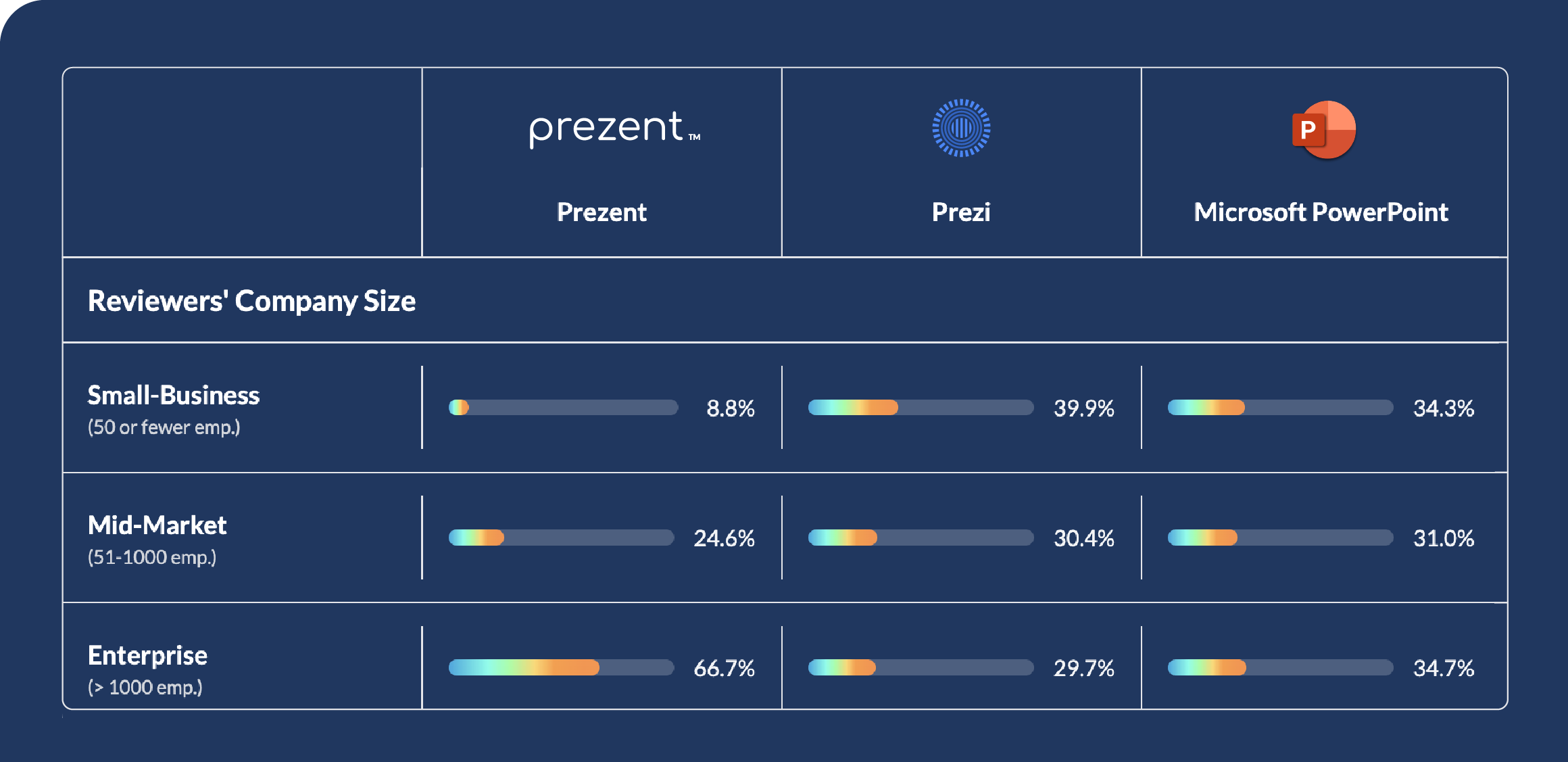 Enterprise presentation needs are complex. According to G2, over 66% of enterprise firms prefer Prezent because teams today need more than slides—they need decks that are on-brand, persuasive, and built for decision-making at scale.